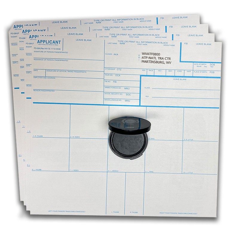 Our At Home Fingerprint Kit includes everything you need to obtain clear and legally acceptable fingerprints. It contains a premium ink pad designed for sharp impressions, three FD-258 fingerprint cards—officially recognized by the FBI—and postage-paid return packaging. This kit lets responsible persons or trustees capture their prints in compliance with NFA transfer regulations from their own home.