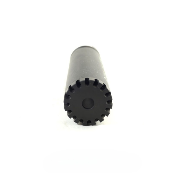 The APC9/SPC9/GHM9 RBS silencer has large decibel reduction but, thankfully, a small footprint.  At just 6.5″ in length, it’s long enough to provide enough volume for suppression but without any excess length to get in the way.  Using a modified gate-lock-inspired 3-lug mount, the silencer will quickly attach to any 9mm 3-lug muzzle device.  Releasing it is easy, just a push of a button.  This reimagining prevents movement and provides extra security when installed onto the host firearm.