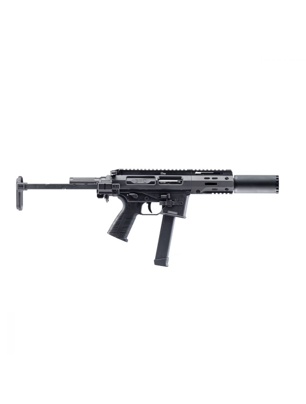 Born from a request for a 9mm carbine with the same handling characteristics and ergonomics as the AR platform; the all-new B&T SPC9 PDW SBR SD incorporates many of the features found on the B&T APC9, MP5 and AR platforms combined into one, very versatile platform. Lightweight and reliable, well balanced and accurate, safe and modular — the SPC9 checks all the boxes and is one of the lightest recoiling 9mm carbines available, thanks to B&T’s innovative and effective hydraulic buffer system.This SPC9’s lower receiver has also been outfitted to accept the widely available Glock magazines.
