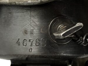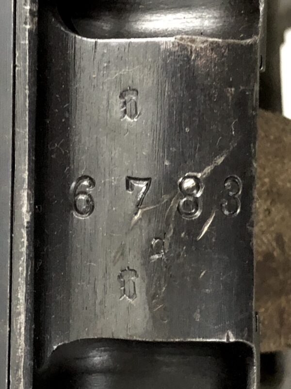 The weapon itself is in excellent mechanical and cosmetic condition. The original bluing is in stupendous condition for a weapon that is 100+ years old, with only minor handling and wear marks on the rough edges. The metalwork is in fantastic condition with no corrosion, cracks, gouges, malformations, etc. Overall finish is roughly 97%, with only minor wear and handling marks noted. There are some minor dings in the metal to be noted on the barrel shroud, but nothing that would be any cause for concern, and nothing that penetrates the bluing of the metal. This is an original production gun, and is not a side plate, reweld, or reactivated DEWAT.