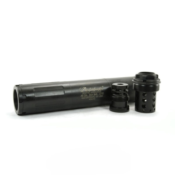 The  Bushwhacker 46 2.0 from Griffin Armament was made to match any other universal suppressor on the market and then exceed them. It is rated for virtually every rifle caliber, from 22 long rifle to 45-70. Most other rifle silencers on the market are rated from 5.56 to 300 Win Mag. It has the performance, features, and available accessory options to make it one of the most versatile suppressors on the market. In addition to rifle and rimfire suppression, it can be used on pistols up to 45 ACP. This truly is a jack of all trades.