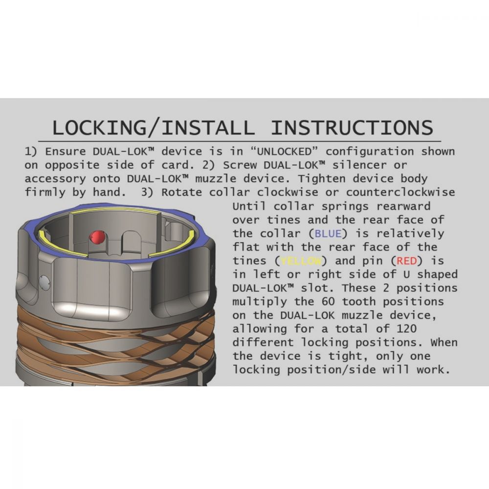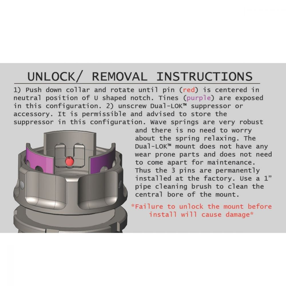 DUAL-LOK suppressors earn their name from Griffin Armament’s innovative mounting system. The DUAL-LOK locking collar engages anti-rotational grooves on the muzzle device with 3 locking splines; your suppressor will remain locked while shooting and you can easily remove it after a day of hard use at the range day or a demanding hunt. The new DUAL-LOK silencers are affixed to the precision taper mount with ACME threads, providing repeatable Point of Impact (POI). Just zero your rifle once and you’re done. Griffin designed the DUAL-LOK without any wear points, this rock solid mount requires no disassembly or maintenance from the end user.
