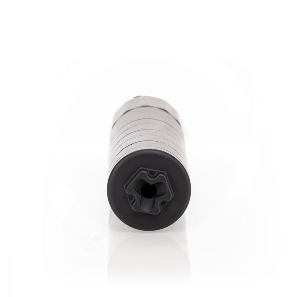 It features our utility patented ECO-FLOW™ baffle system offering the apogee of multi-caliber sound performance. This baffle system reduces back pressure which alleviates much of the blow back through semi auto actions providing a more comfortable experience to the end user. This baffle system is tuned such that performance at the muzzle of the suppressor and the ears of the operator are balanced for a uniform and low sound signature in the immediate vicinity of the shooter.