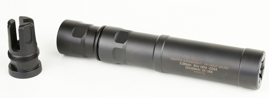 NOTE: the silencer is 22 caliber only and use of the Optimus Micro on a 30 caliber Griffin Taper Mount and firearm of caliber larger than .22″ will result in damage to the silencer.