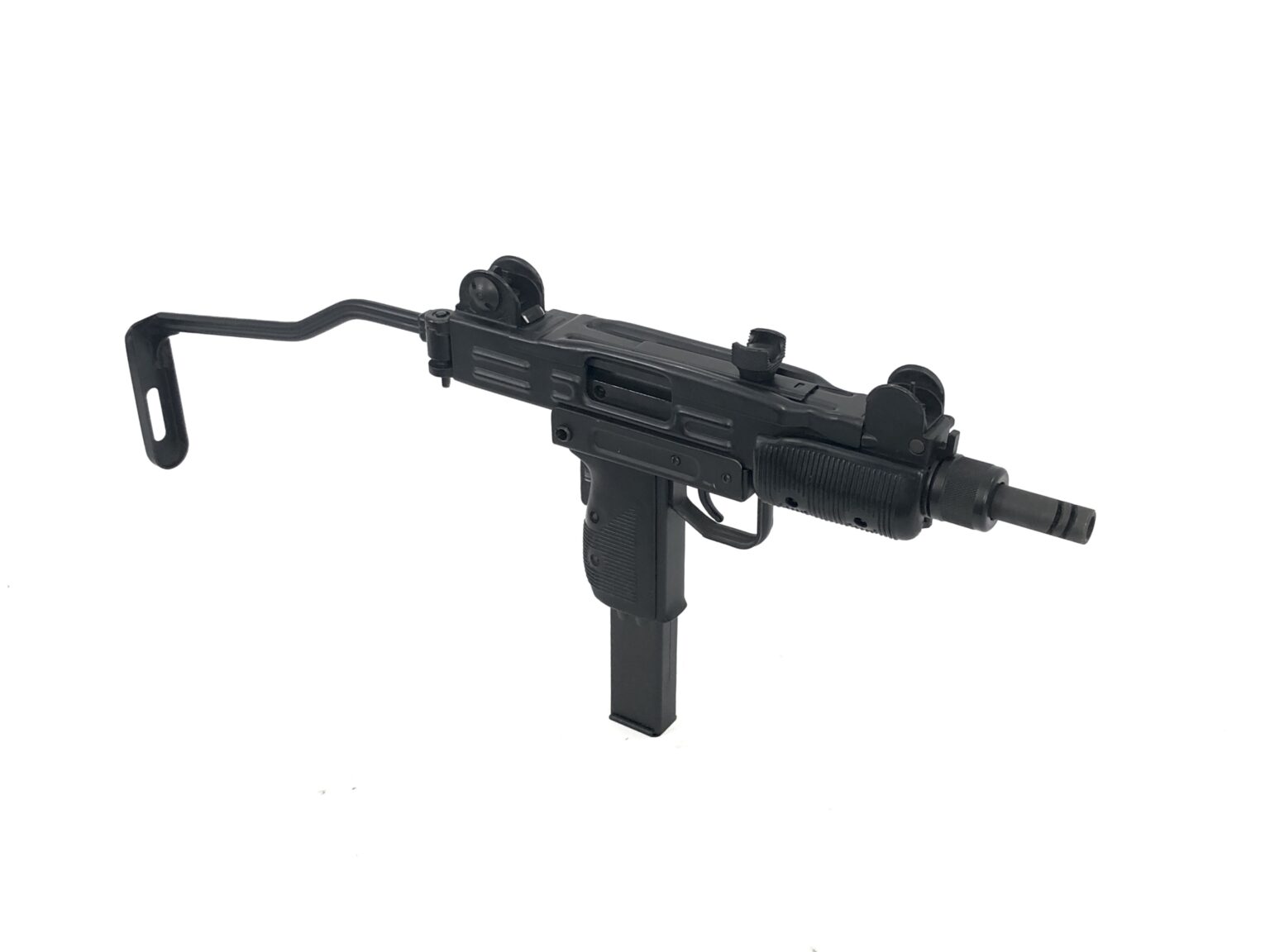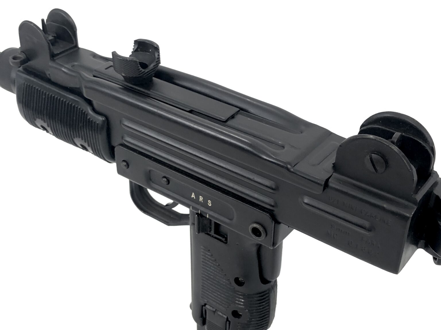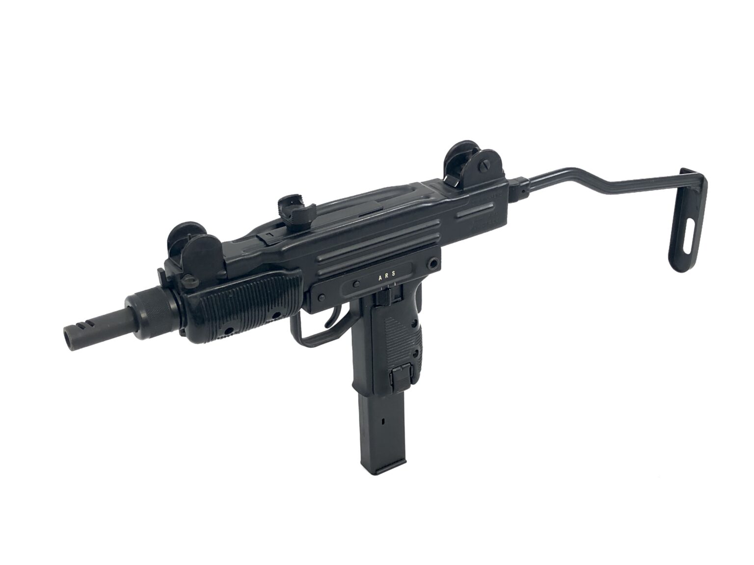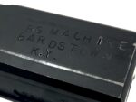 This fantastic open bolt transferable machine gun consists of a B&G Machine NFA registered, slotted Uzi SMG full-auto bolt setup in an original Action Arms of Philadelphia imported IMI Mini Uzi 9mm Carbine. The lower features “A, R, and S” marked fire controls, for full-automatic, semi-automatic, and safe selections, respectively. The registered slotted Uzi SMG bolt has had its feet fitted correctly for clearance of the Mini Uzi’s original skeletonized trunnion. This model retains the barrel restrictor ring, but features a Mini Uzi correct factory ported IMI Mini Uzi SMG barrel that has been properly fitted to the weapon.