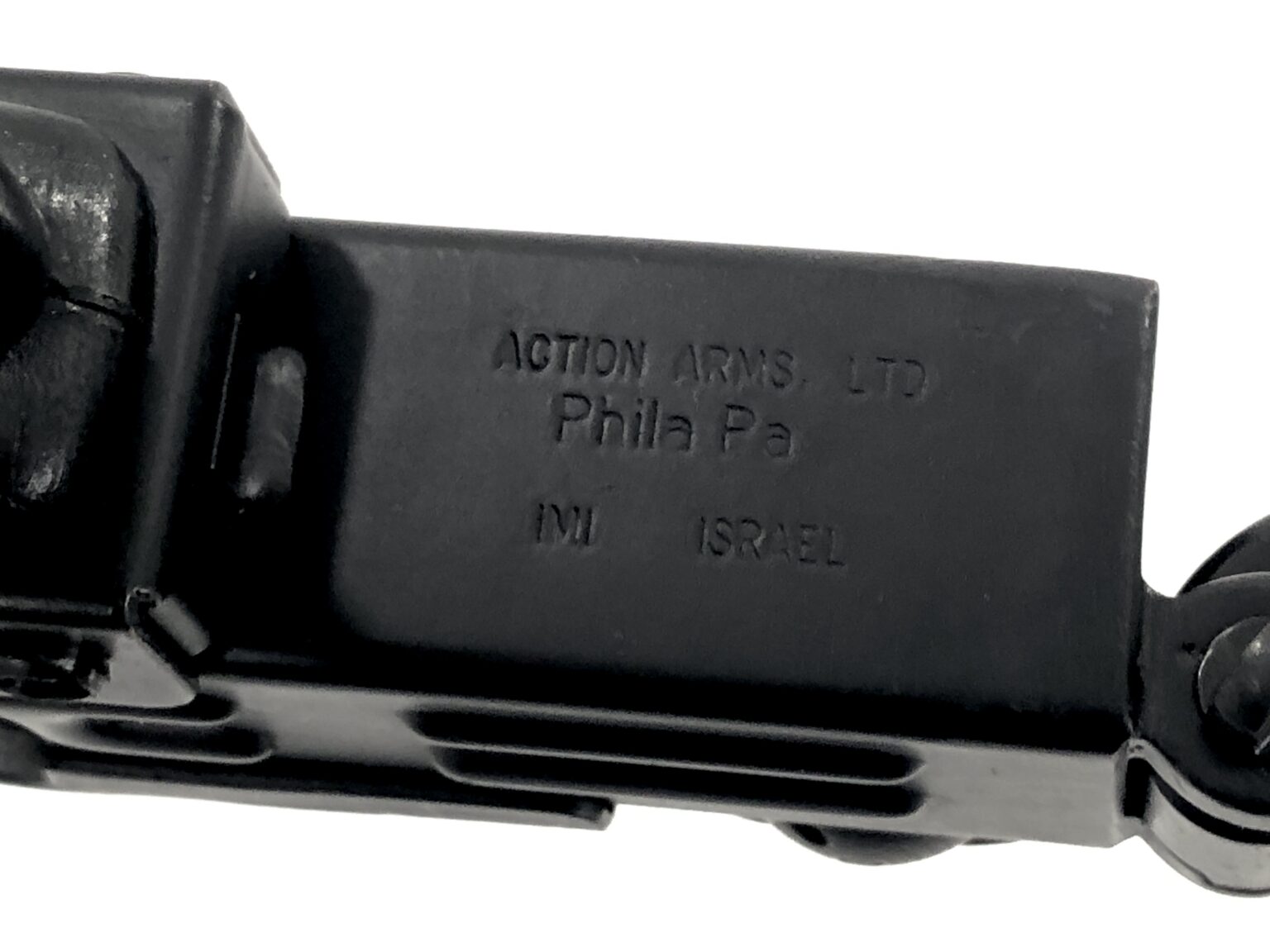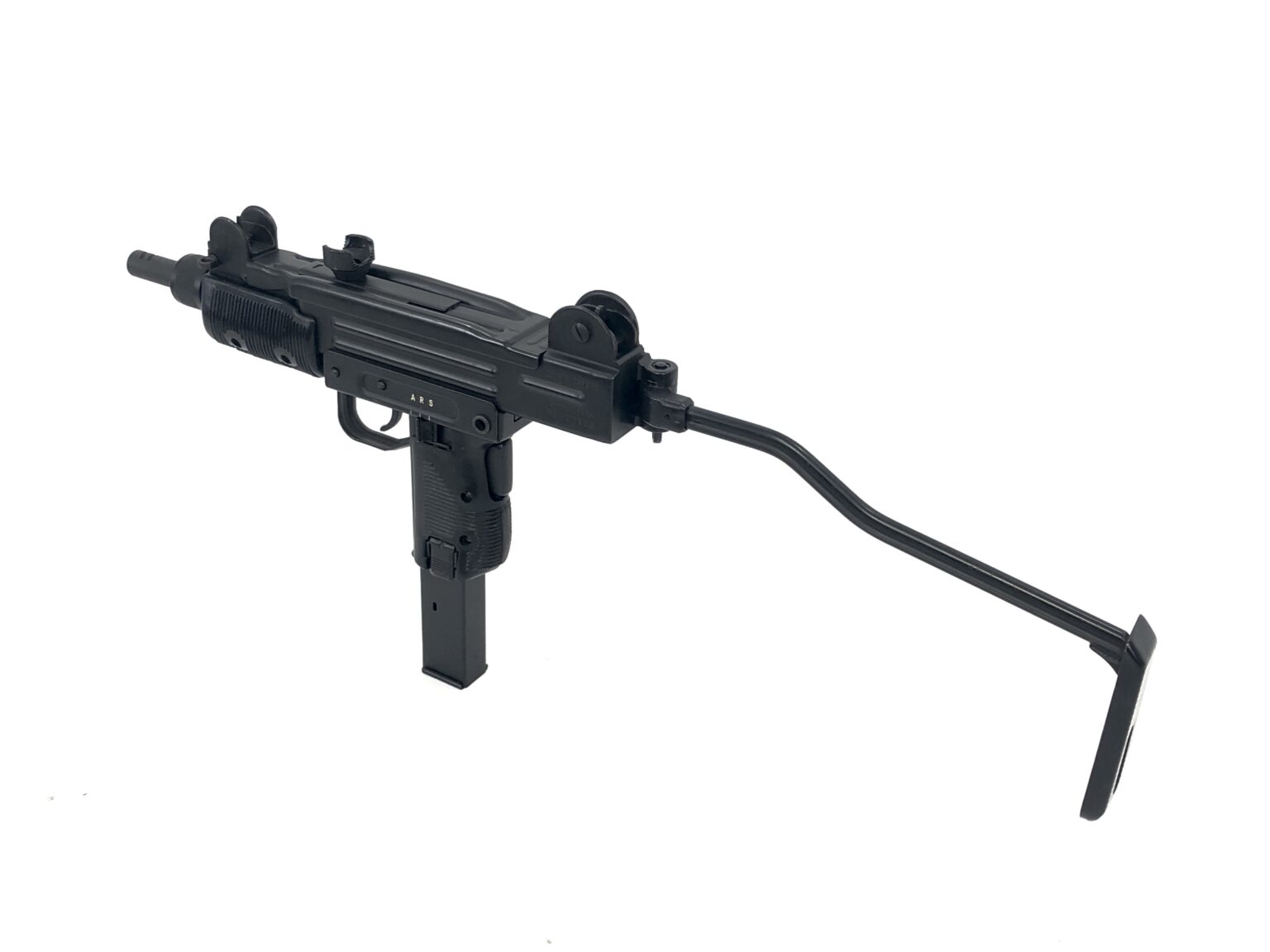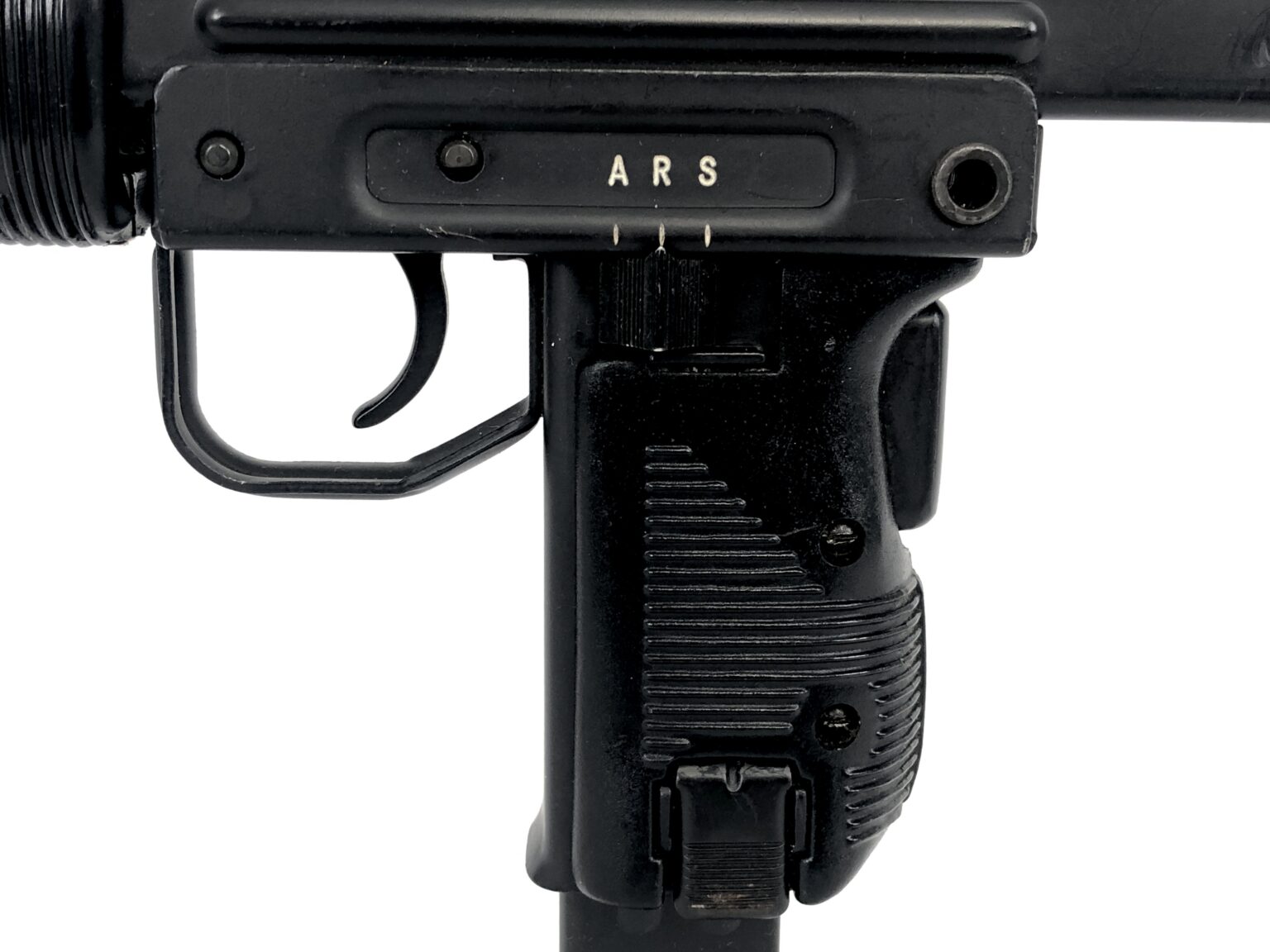 This fantastic open bolt transferable machine gun consists of a B&G Machine NFA registered, slotted Uzi SMG full-auto bolt setup in an original Action Arms of Philadelphia imported IMI Mini Uzi 9mm Carbine. The lower features “A, R, and S” marked fire controls, for full-automatic, semi-automatic, and safe selections, respectively. The registered slotted Uzi SMG bolt has had its feet fitted correctly for clearance of the Mini Uzi’s original skeletonized trunnion. This model retains the barrel restrictor ring, but features a Mini Uzi correct factory ported IMI Mini Uzi SMG barrel that has been properly fitted to the weapon.