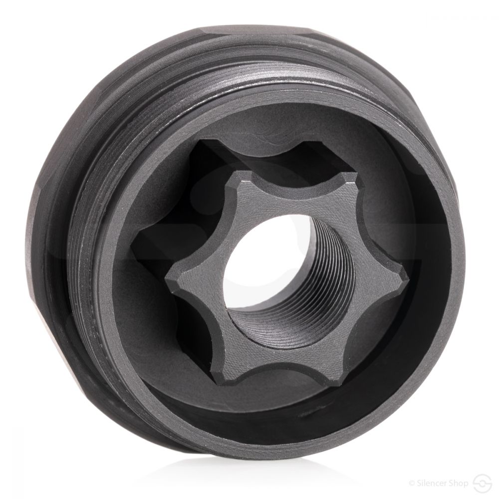 The exterior of the thread mount (the part that screws into the solvent trap tube) uses the industry standard 1.375×24 TPI, JK’s thread mount is compatible on many mounting options, including Dead Air’s Key-MO, SilencerCo’s ASR, and the Q Plan B.