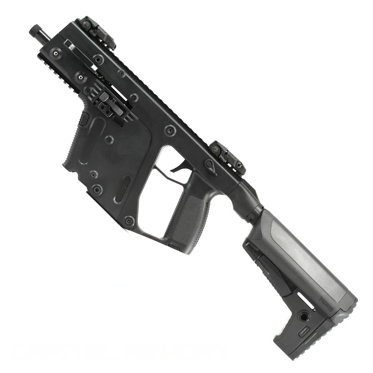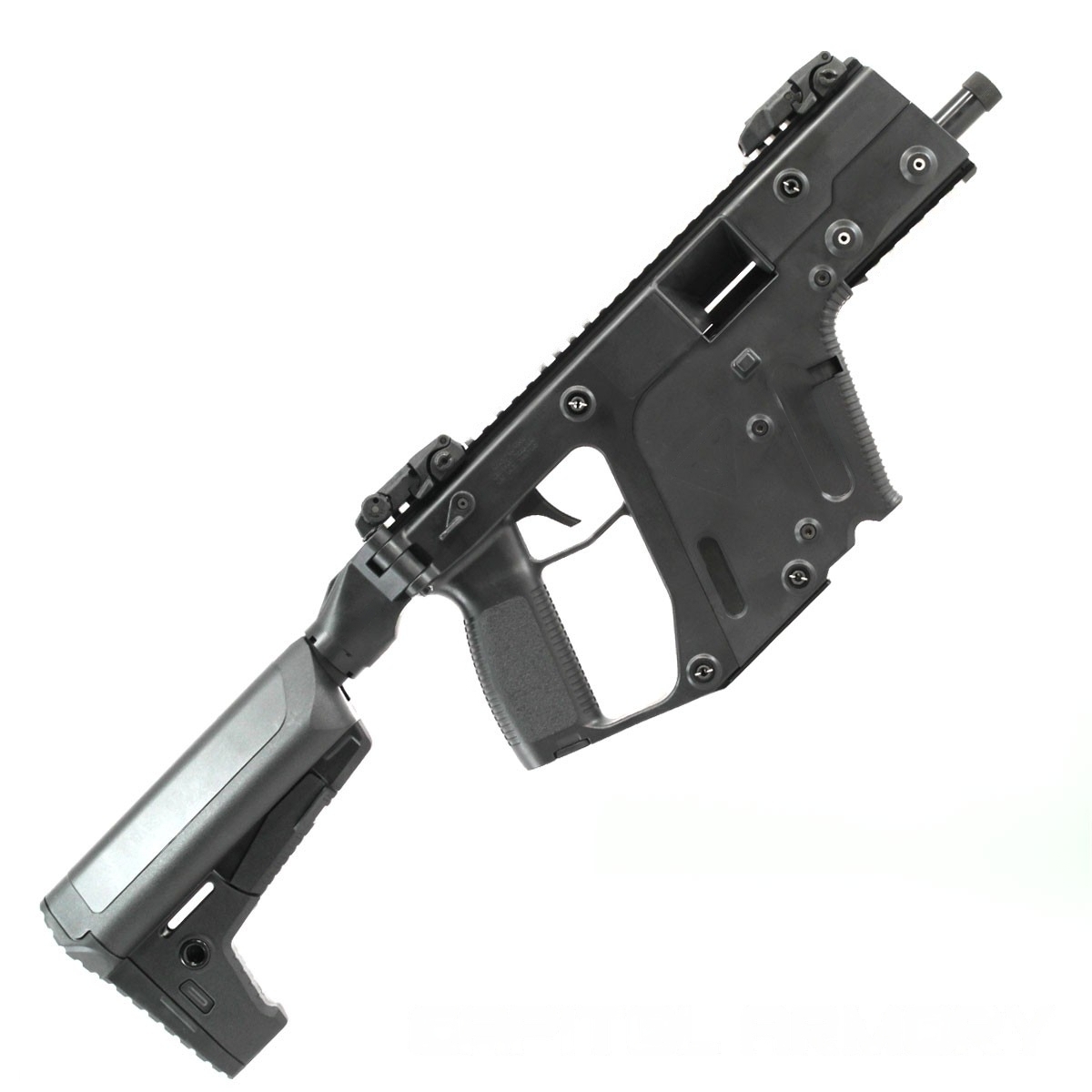 Package standard equipment includes a fixed Kriss M4 style stock (not pictured), top/bottom Picatinny Rails, ambidextrous F/S controls, MagPul MBUS sights, foregrip, cable lock and one Glock 21 13-round magazine.