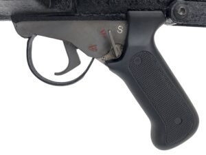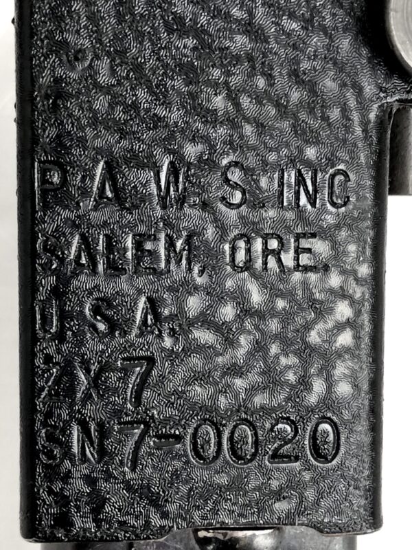 Utilizing easy-to-come-by M3 Grease gun magazines, the ZX-7 functions amazingly well, with a cyclic rate of around 750 RPMS, making it markedly faster than the M3 Grease Gun and more in line with a 1928 Thompson.  Robust and controllable, the ZX-7 in .45acp was only made in very small numbers by P.A.W.S. as a transferable SMG. Some counts have them as low as 20 or 25, as the 9mm version (the P.A.W.S. ZX-5), was made in significantly greater quantities. This specific model is serial number 20.