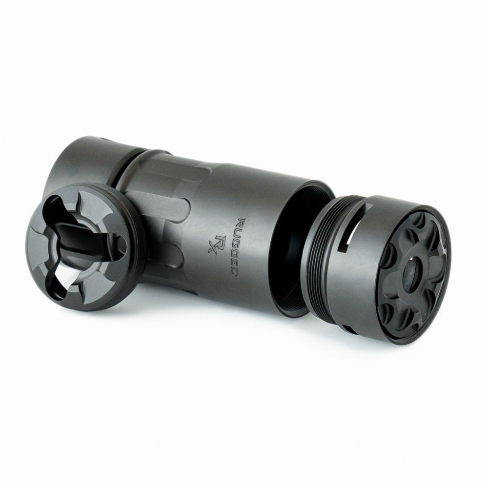 Rugged Rx modular blast diverter and brake. Just like Rugged’s modular rifle and pistol suppressor’s, this revolutionary design allows the end-user to choose between a blast diverter or muzzle brake by simply unthreading the brake module and changing muzzle caps (included).
