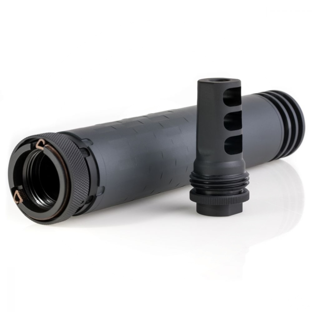 The SilencerCo Omega 300 is a full-auto and magnum rated silencer ideal for rifle owners and avid outdoorsmen. With a 14.2-ounce weight and 7-inch length, the Omega 300 is constructed of titanium, stainless steel, and stellite, which provides optimal durability and versatility. Included in the purchase of SilencerCo’s Omega 300 comes their 5/8×24 thread mount, QD active spring retention (ASR) mount, and their Specwar ASR 5/8×24 muzzle brake.