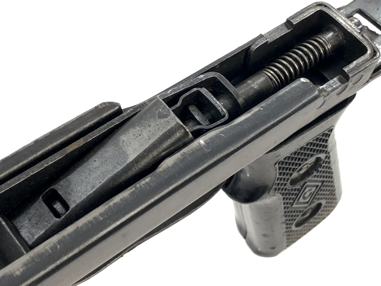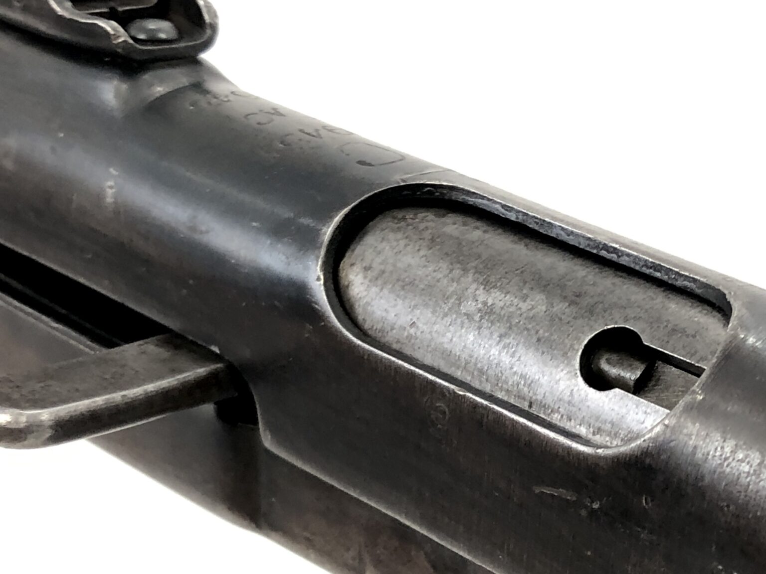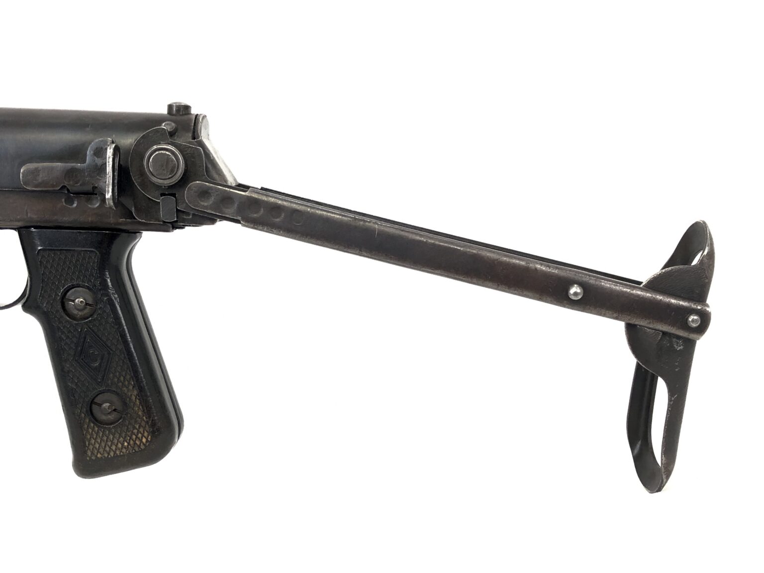 Overall, this weapon is in excellent functional condition. The metalwork notes no dings, dents, cracks, etc. The internals note only minor wear markings. The bolt face remains crisp and clean. The bore is bright and shiny with crisp, clean rifling. The open bolt action remains buttery smooth in operation, with strong spring tension to the operating rod. The rear of the receiver has a small malformation of the sheet steel at the take down lever, but nothing that is more than cosmetic in nature. All folding mechanisms, take down controls, and mechanical systems operate smoothly and appropriately.