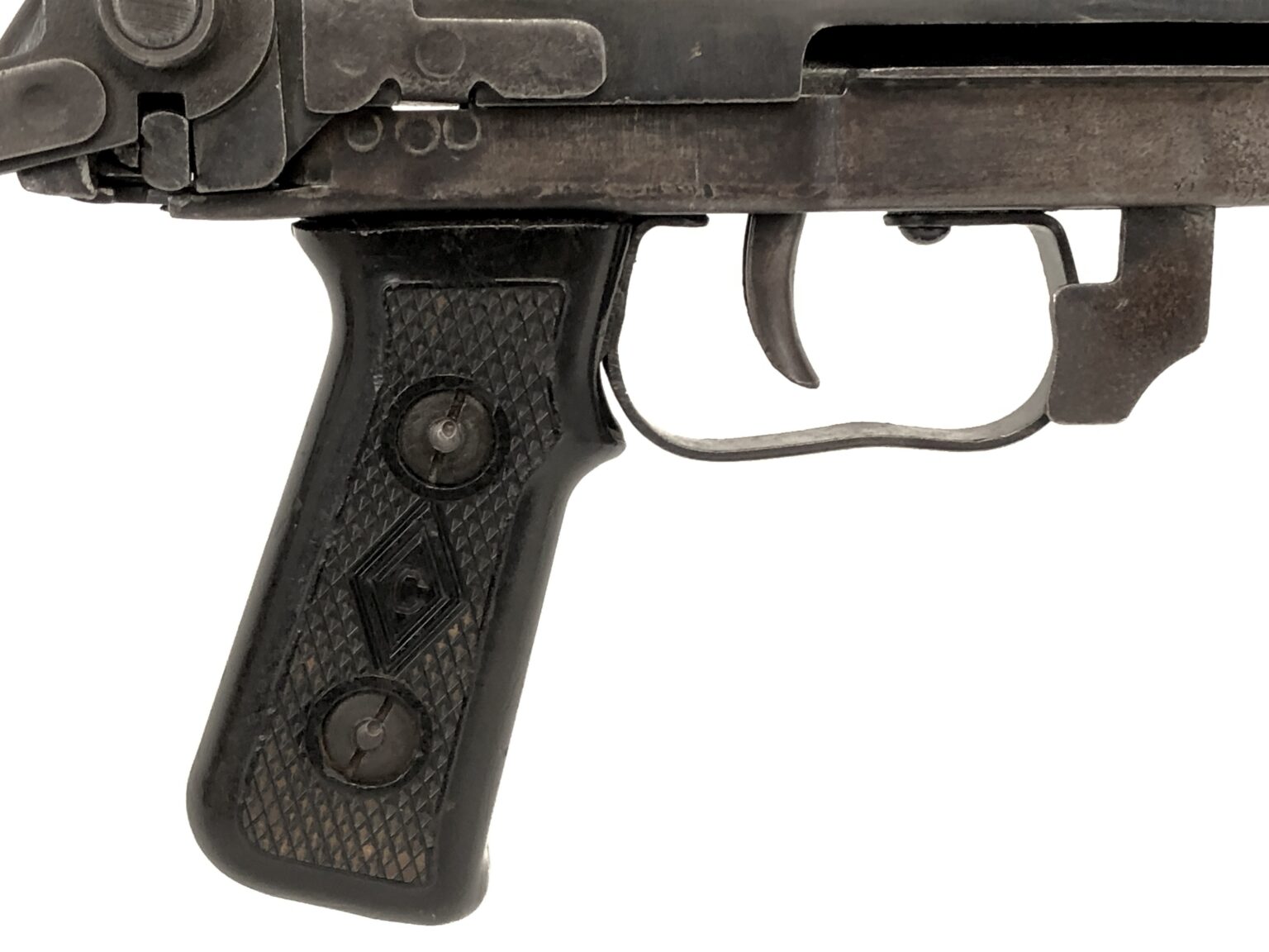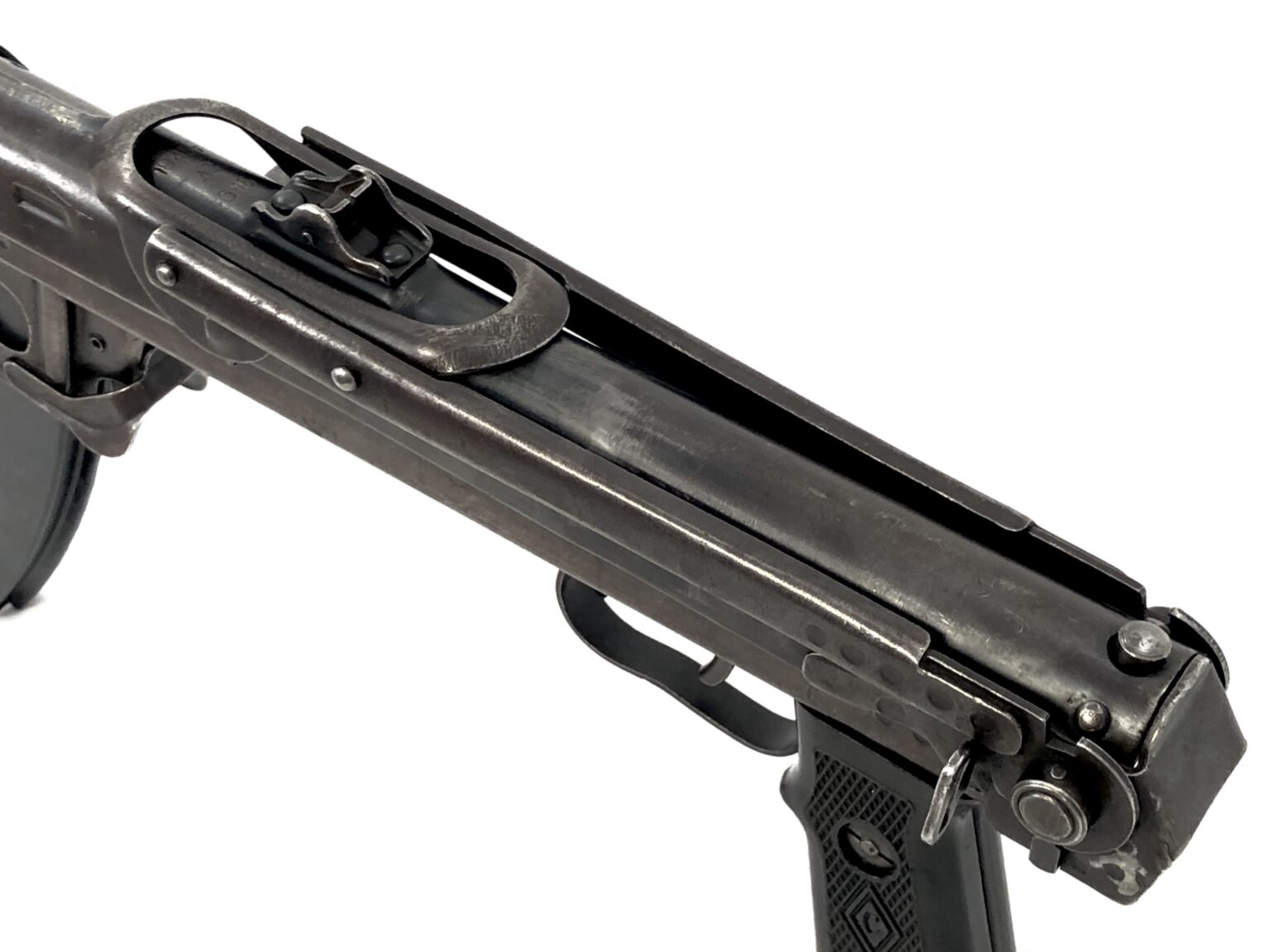 This amazing NFA transferable machine gun was NFA registered by Charles E. Lindley III / CELCO of Kansas City, MO and appears to be from all original Soviet Union PPSh-43 parts. The receiver top plate proudly displays a “C” for the Russian state factory marking from which it was originally produced. These markings are also matched on the grips of this weapon with a corresponding “C” inside of an enclosed diamond. The receiver also features the Cyrillic letter markings of “1945r” for production year and “AC 645” for the original Russian-assigned serial number. The bolt also proudly displays this matching number stamped into the underside of the charging handle. However, the NFA registered serial number for this weapon utilized by Mr. Lindley is different than the original Russian number, and was added to the right side of the receiver.