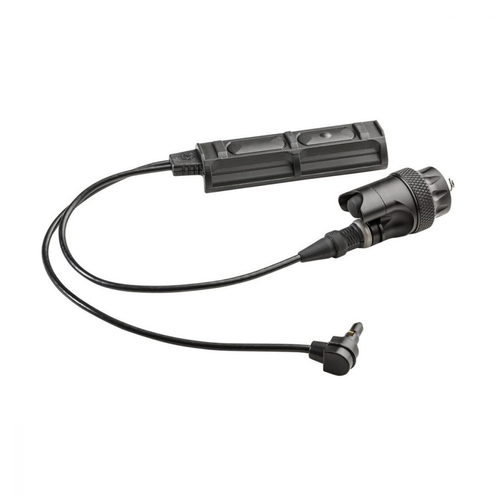The DS-SR07-D-IT is a waterproof switch assembly for simultaneous use of SureFire Scout Light® WeaponLights (excludes Micro Scout Light Pro) and an ATPIAL or DBAL laser. It includes a system-disable feature, a click-on/off pushbutton switch, and a plug-in SR07-D-IT dual-control switch assembly with a 7-inch momentary-on and a dome-style on/off remote tape switch. The integrated pushbutton and remote switch assemblies operate independently, providing switch redundancy.
