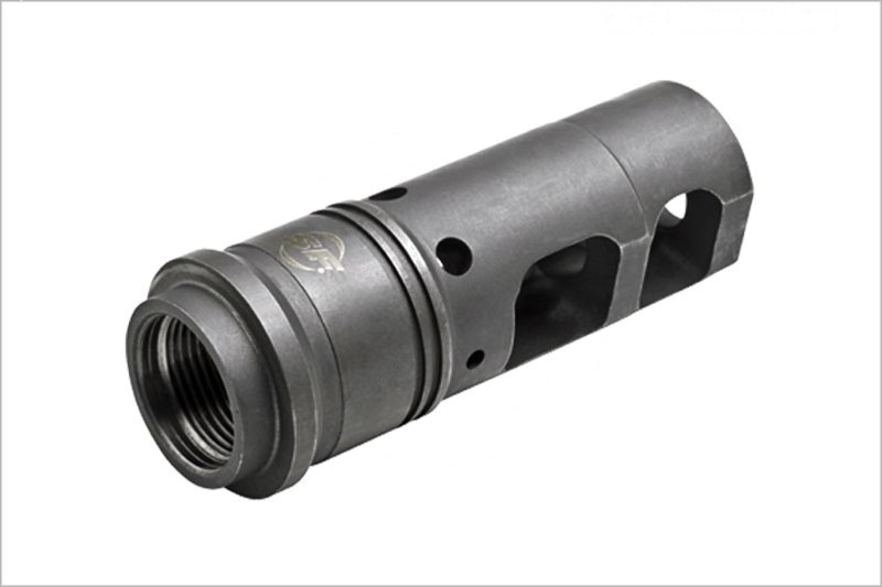The advanced SureFire SFMB-762-5/8-24 muzzle brake, which fits the Armalite AR-10, DPMS LR308, and 7.62 mm rifles with 5/8-24 muzzle threads, greatly reduces both recoil impulse and muzzle rise and features neutral porting that loads bi-pod legs evenly. Its patented Impulse Diffusion design minimizes side blast and rear-directed concussion effects. The SFMB-762-5/8-24 also serves as a rock-solid mounting adapter for SureFire SOCOM Series 7.62 mm Fast-Attach® suppressors, the SOCOM762-RC model having recently won the Mk13 .300 Win-Mag sniper rifle contract award with the US Special Operations Command in the most extensive and rigorous suppressor testing ever conducted.