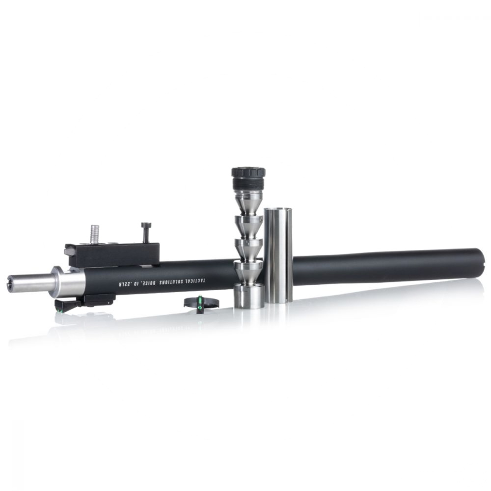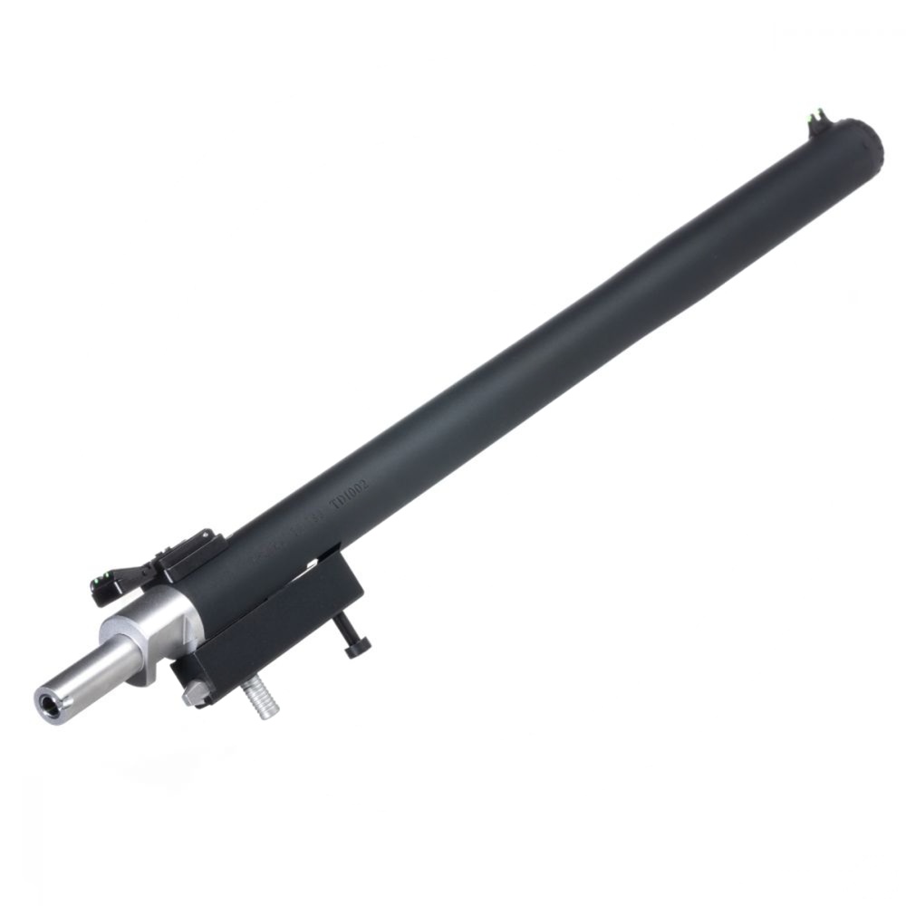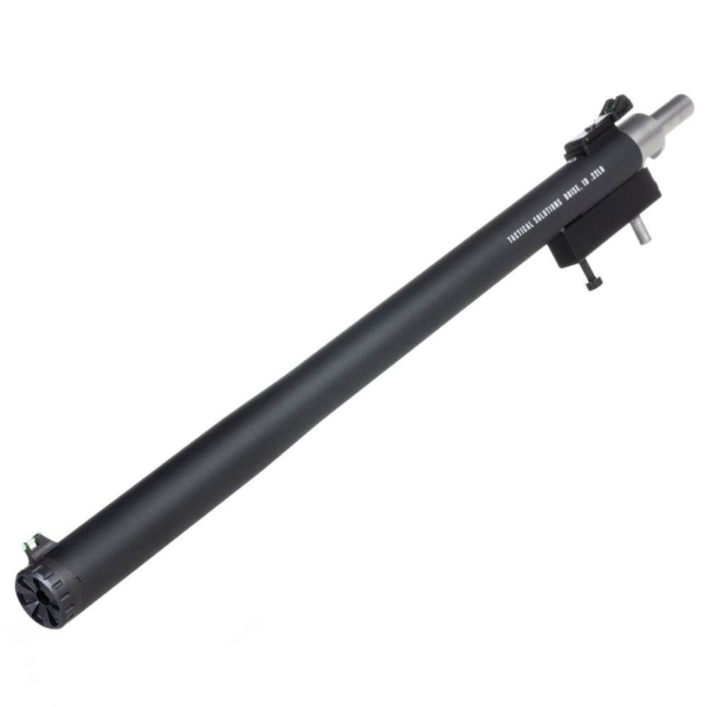 Tactical Solutions’ X-Ring Takedown TSS Barrel steps it up with the only integrally suppressed barrel hosting a patent pending front fiber-optic sight system. Its matte black finish offers a sleek barrel for TacSol X-RING receivers and Ruger 10/22 style receivers, all while weighing in under 17 ounces for the overall bore length of 16.75 inches. This featherweight barrel is a heavy weight contender with its durable aluminum barrel, chromoly steel bore, and easy to remove stainless steel split tube.