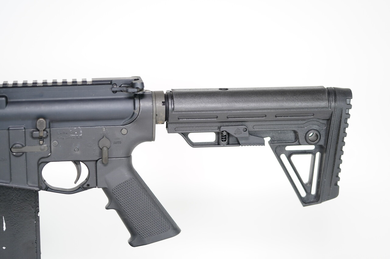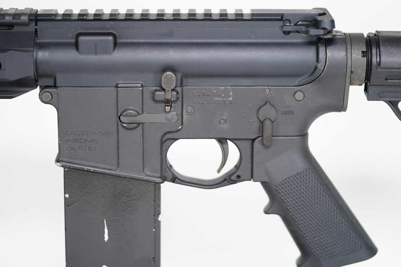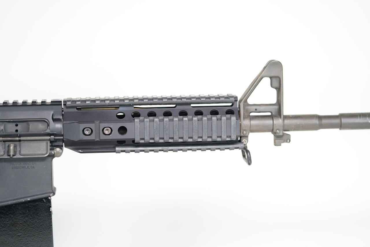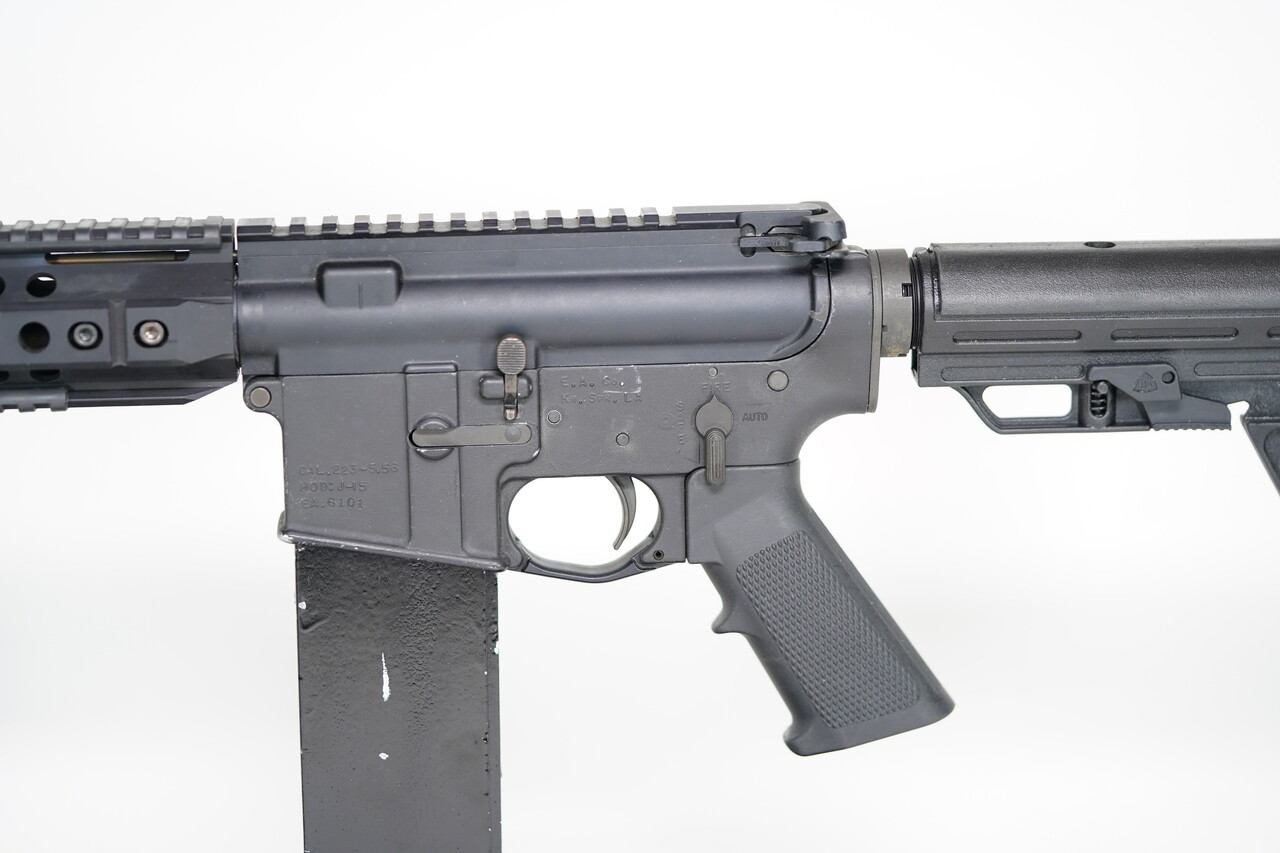 This is a registered receiver conversion of an Essential Arms Machine Gun with a 14.5 inch barrel and quad rail. This is a raised mag fence with push pin so you can swap out uppers very easily.