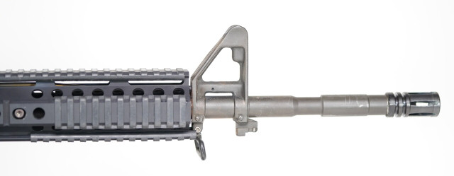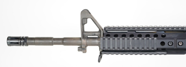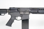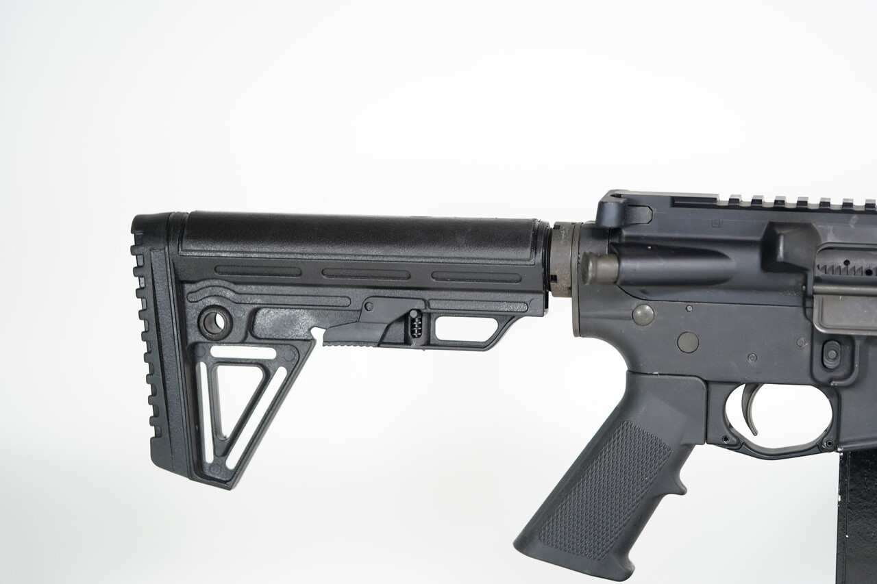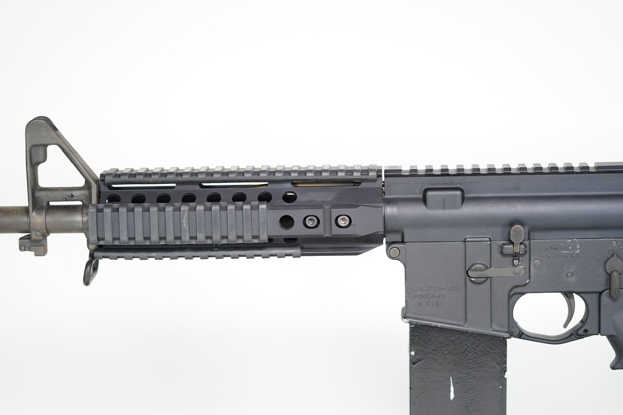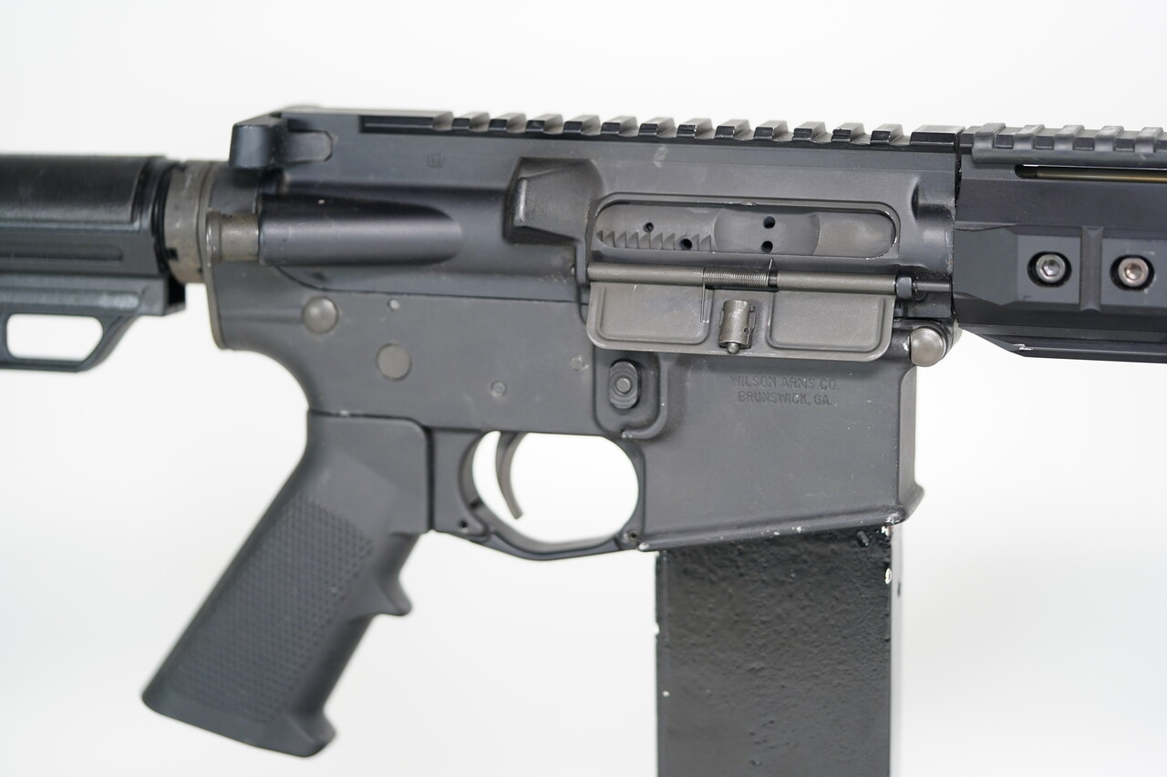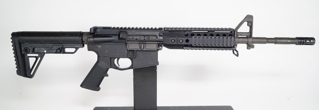 This is a registered receiver conversion of an Essential Arms Machine Gun with a 14.5 inch barrel and quad rail. This is a raised mag fence with push pin so you can swap out uppers very easily.